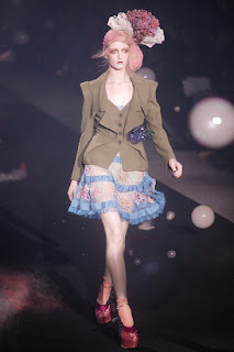 We all know monsieur Galliano is always good for a little surprise. All models looks like goth dolls with a wild floral arrangement. Black lips and sunglasses supports these look of darkness. Main colour are purple, khaki, dark red and of course black. The only good thing from these collection is the cream ball gown with golden sequinns on it. Whats up with that white bird-hat? Looks like a piece from carnival costume.